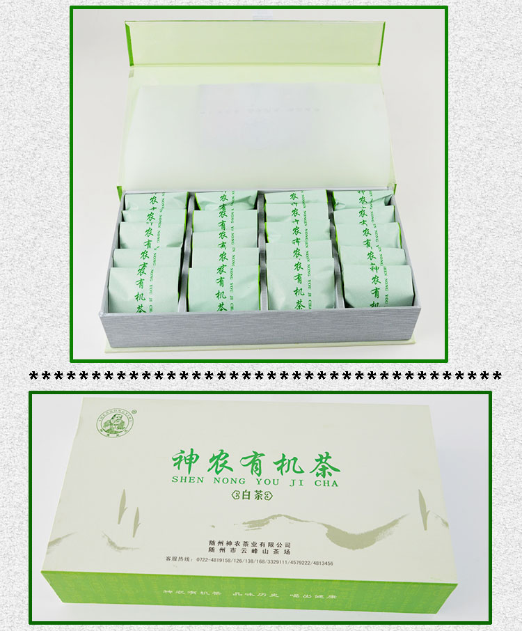 神農(nóng)有機(jī)茶系列之——白茶,采用綠茶加工工藝,選一芽二葉初展的白茶嫩葉為原料,經(jīng)殺青、理?xiàng)l、烘干、提香等工藝加工而制成,屬綠茶類(lèi)。有機(jī)白茶外形挺直略扁,形如蘭蕙;色澤翠綠略帶金黃,白毫顯露;葉芽如金鑲碧鞘,內(nèi)裹銀箭。沖泡后,清香高揚(yáng)且持久,湯色嫩綠明亮,滋味鮮醇、馥郁,清潤(rùn)甘爽,飲畢,唇齒留香,回味甘而生津。葉底嫩綠明亮,葉白脈翠,芽葉朵朵,十分可人。
