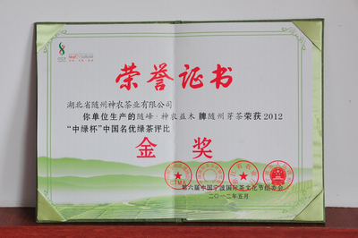 “隨峰、神農(nóng)益木牌隨州芽茶”榮獲2012 “中綠杯”中國名優(yōu)綠茶評比“金獎”